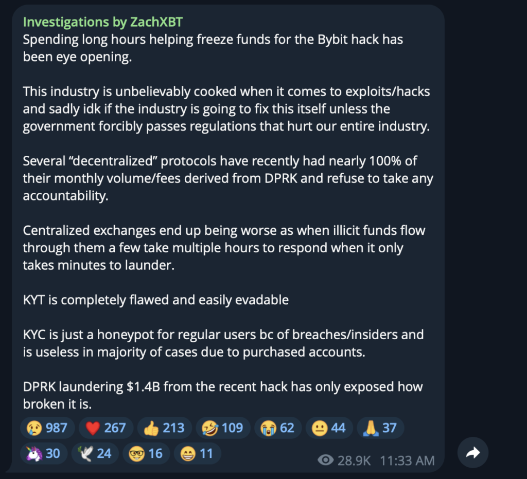 ZachXBT’s investigation also shed light on the broader implications for crypto security, highlighting the prevalence of hacks, phishing attacks, and fraud within the industry. He called out decentralized protocols for being compromised and criticized centralized exchanges for their slow response to fraudulent transactions. Additionally, he raised concerns about the scale of North Korean cybercriminal activity in the crypto sector and questioned the effectiveness of KYC and KYT protocols.